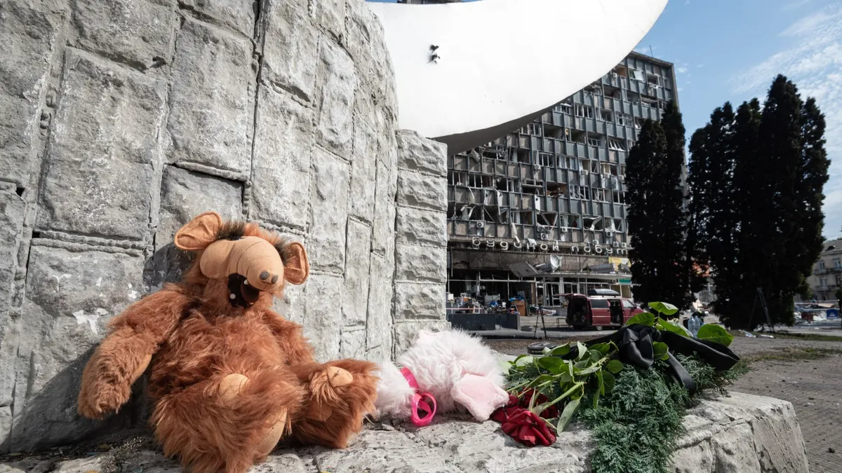 Стихийный мемориал возле поврежденного российским обстрелом здания в Виннице, 15 июля 2022 года. Фото: Alexey Furman / Getty Images