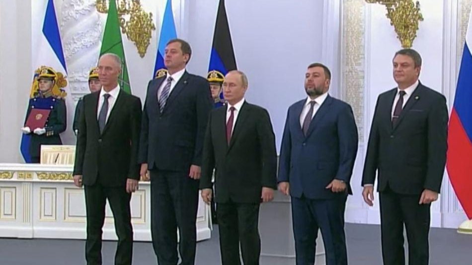 Президент России Владимир Путин и «главы» самопровозглашенных ДНР и ЛНР, а также назначенные Россией главы Запорожской и Херсонской областей Денис Пушилин, Леонид Пасечник, Евгений Балицкий и Владимир Сальдо подписали договоры о присоединении территорий к РФ.