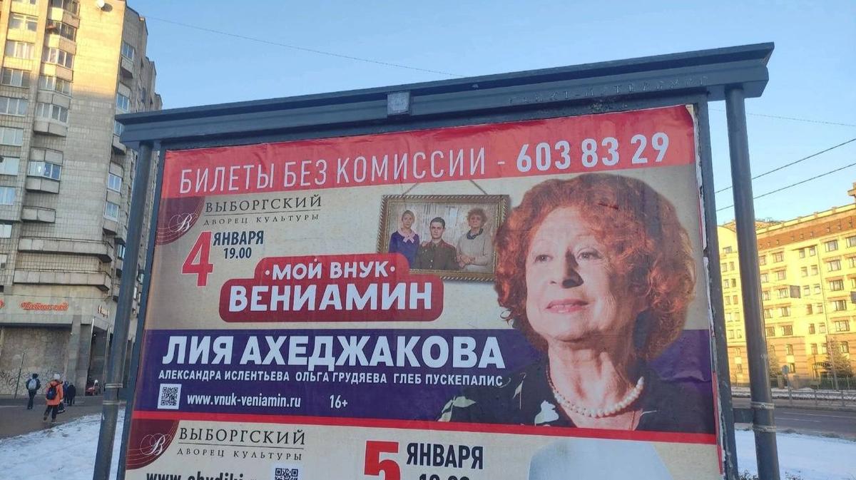 В Санкт-Петербурге Выборгский дворец культуры объявил о переносе спектакля «Мой внук Вениамин» с участием Лии Ахеджаковой. Об этом сообщается на сайте ДК.