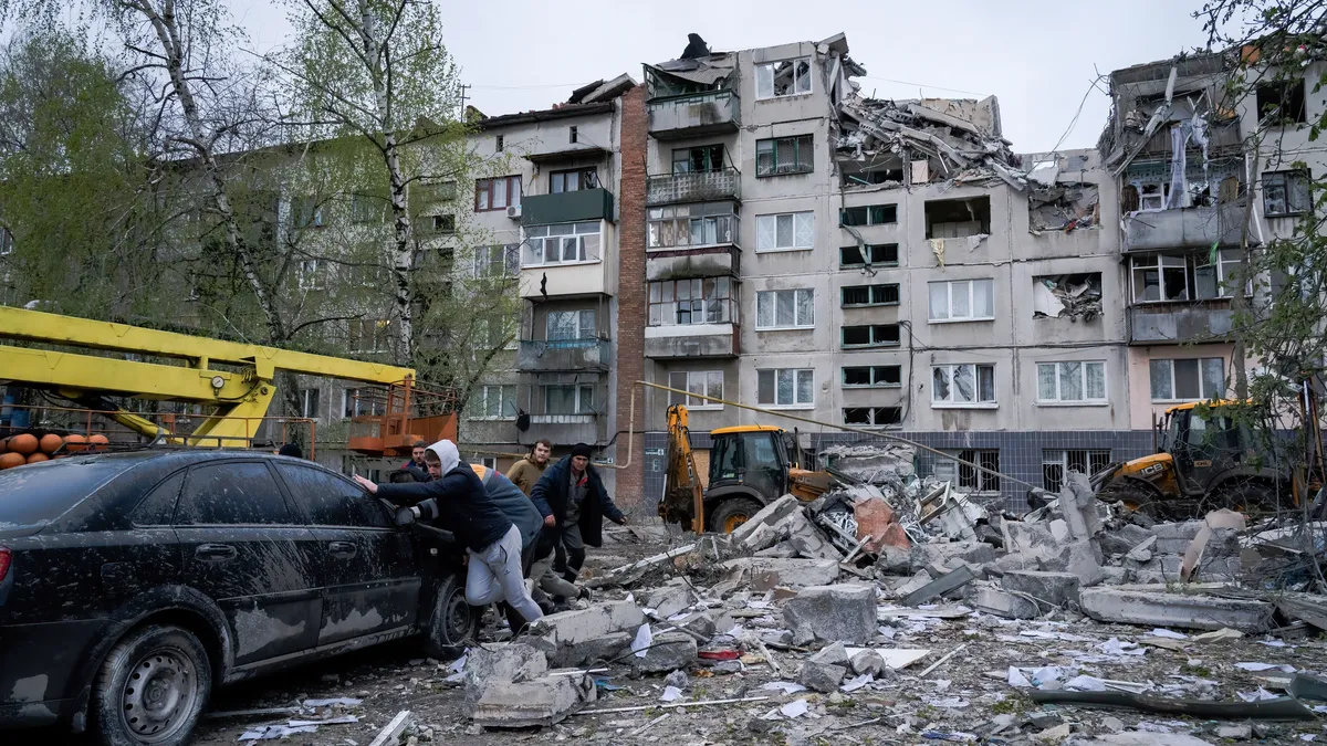 Жилой дом в Славянске после ракетного обстрела российских войск. 14 апреля 2023 года.  Фото: Ashley Chan/SOPA Images/LightRocket via Getty Images