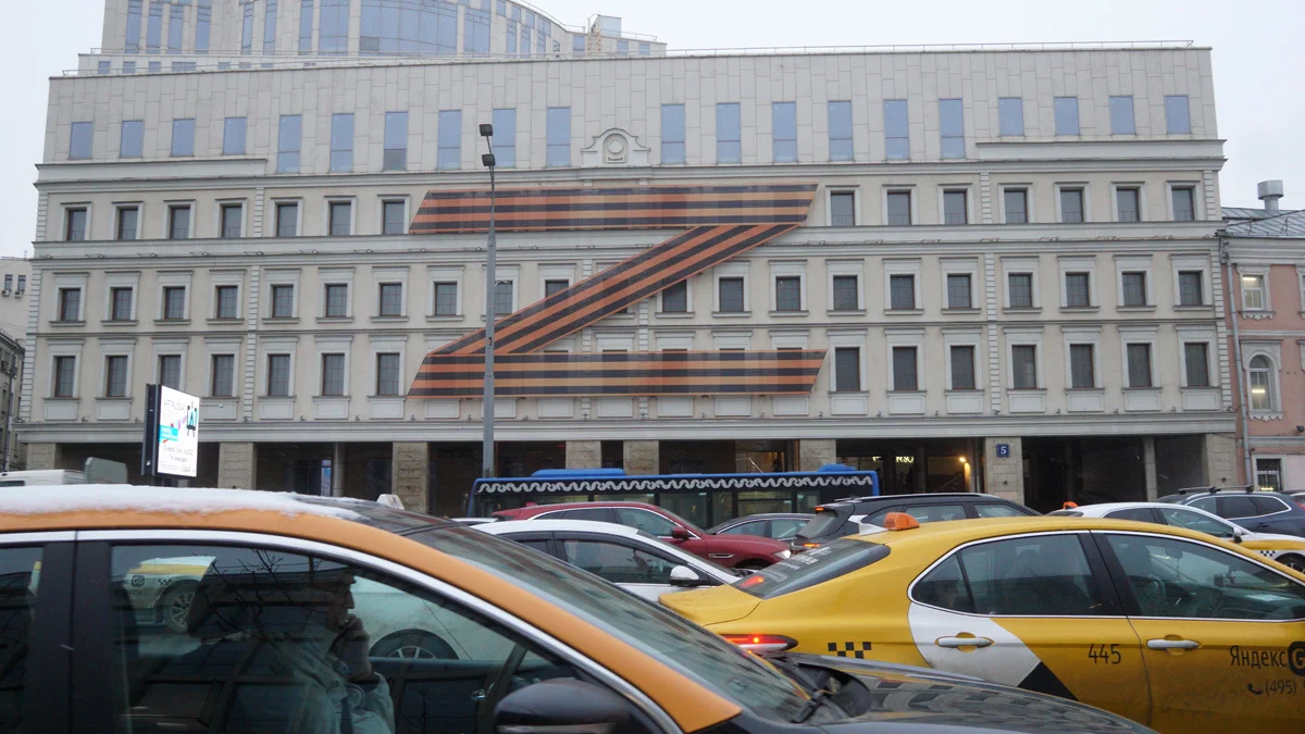 Гигантский символ Z в поддержку российского военного вторжения на Украину на здании театра Олега Табакова, 29 марта 2022 года. Фото: Константин Завражин / Getty Images