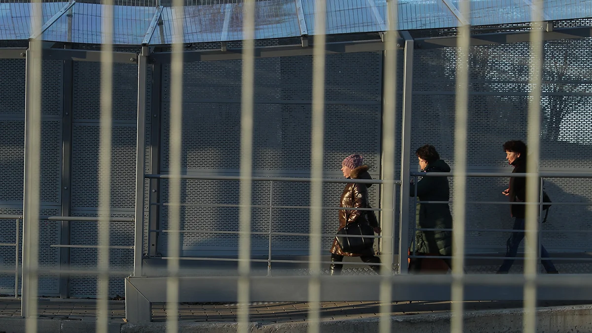 Пешеходы переходят из России в Эстонию за забором вдоль моста через реку Нарва, Эстония, 23 марта 2017 года. Фото: Sean Gallup / Getty Images