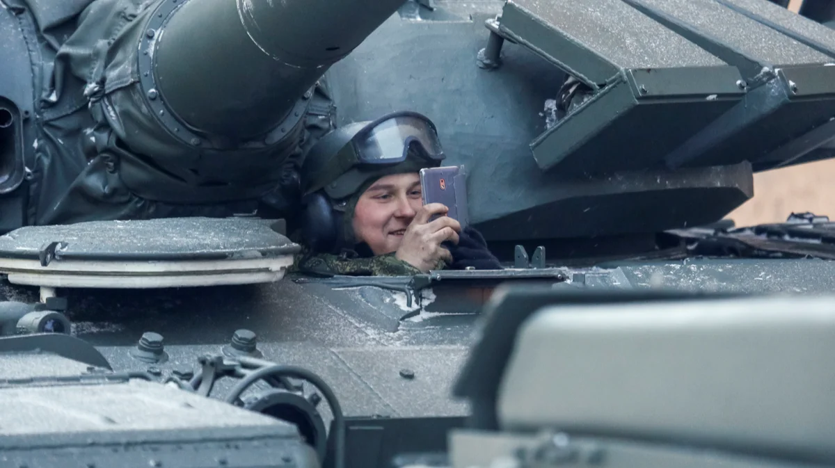 Российский военнослужащий смотрит на свой телефон, сидя в танке перед парадом в честь 75-летия снятия блокады Ленинграда во время Второй мировой войны, в Санкт-Петербурге, Россия, 27 января 2019 года. Фото: Антон Ваганов / Reuters / Scanpix / LETA