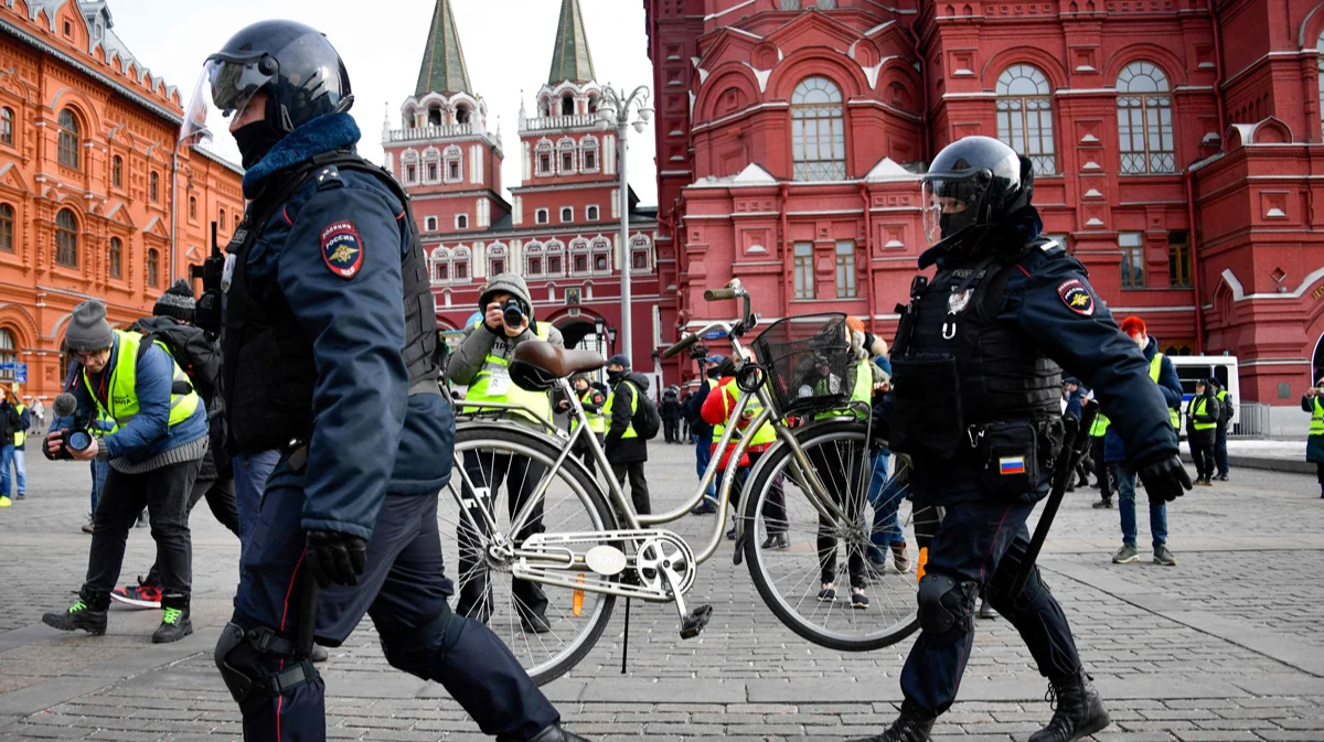 Сотрудники полиции уносят велосипед задержанного во время акции протеста против вторжения России в Украину, Москва, 13 марта 2022 года. Фото: AFP / Scanpix / LETA