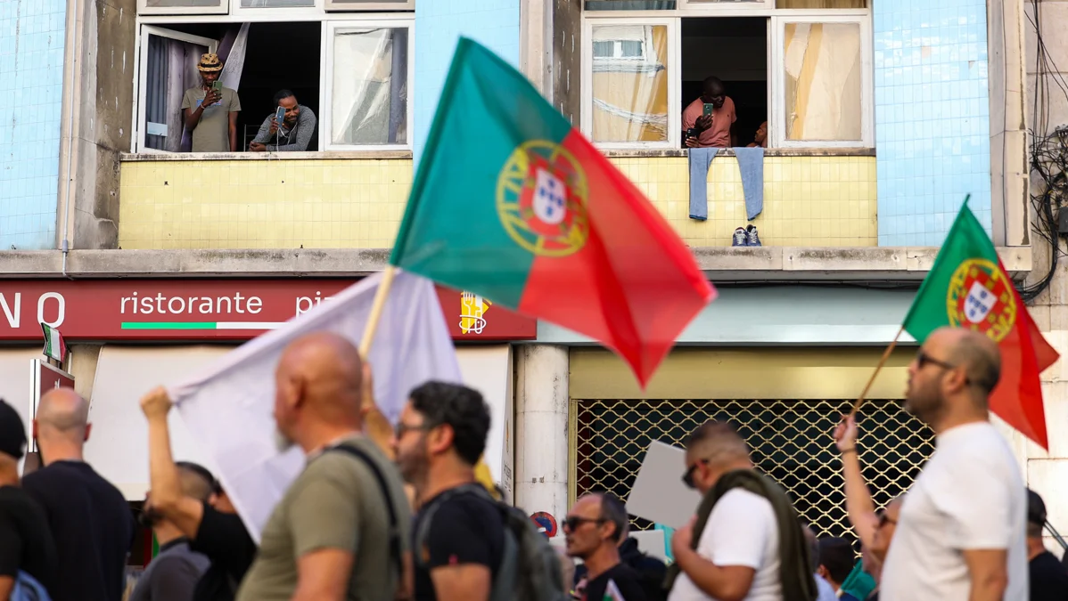 Мигранты наблюдают из окон за демонстрацией против неконтролируемой миграции, организованной ультраправой партией «Chega», Лиссабон, Португалия, 29 сентября 2024 года. Фото: Jose Sena Goulao / EPA-EFE