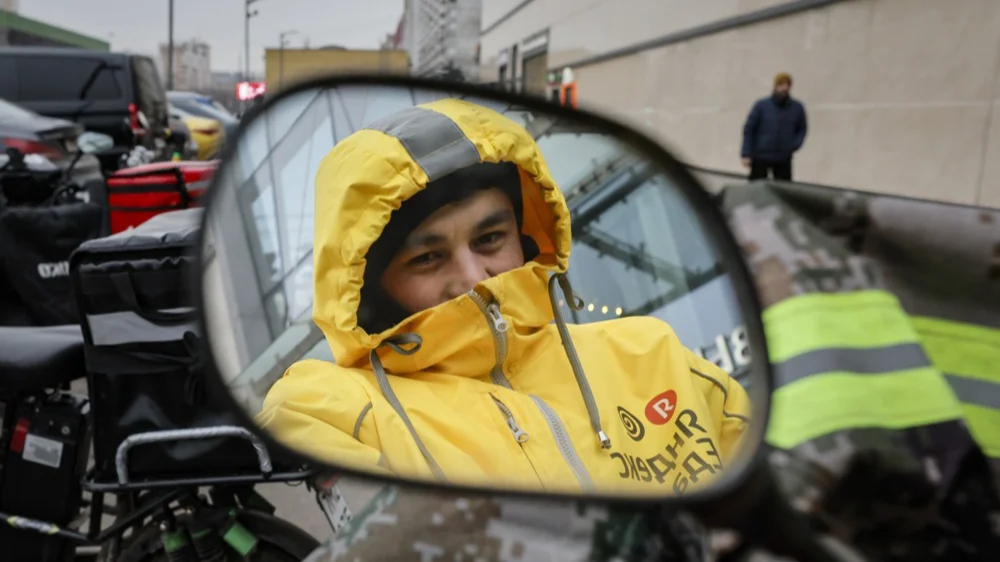 Доставщик еды ждет заказ возле магазина в Москве. Фото: Юрий Кочетков / EPA-EFE