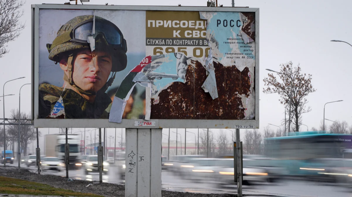 Поврежденный плакат с рекламой воинской службы по контракту, Санкт-Петербург, 24 февраля 2024 года. Фото: Дмитрий Ловецкий / AP Photo / Scanpix / LETA