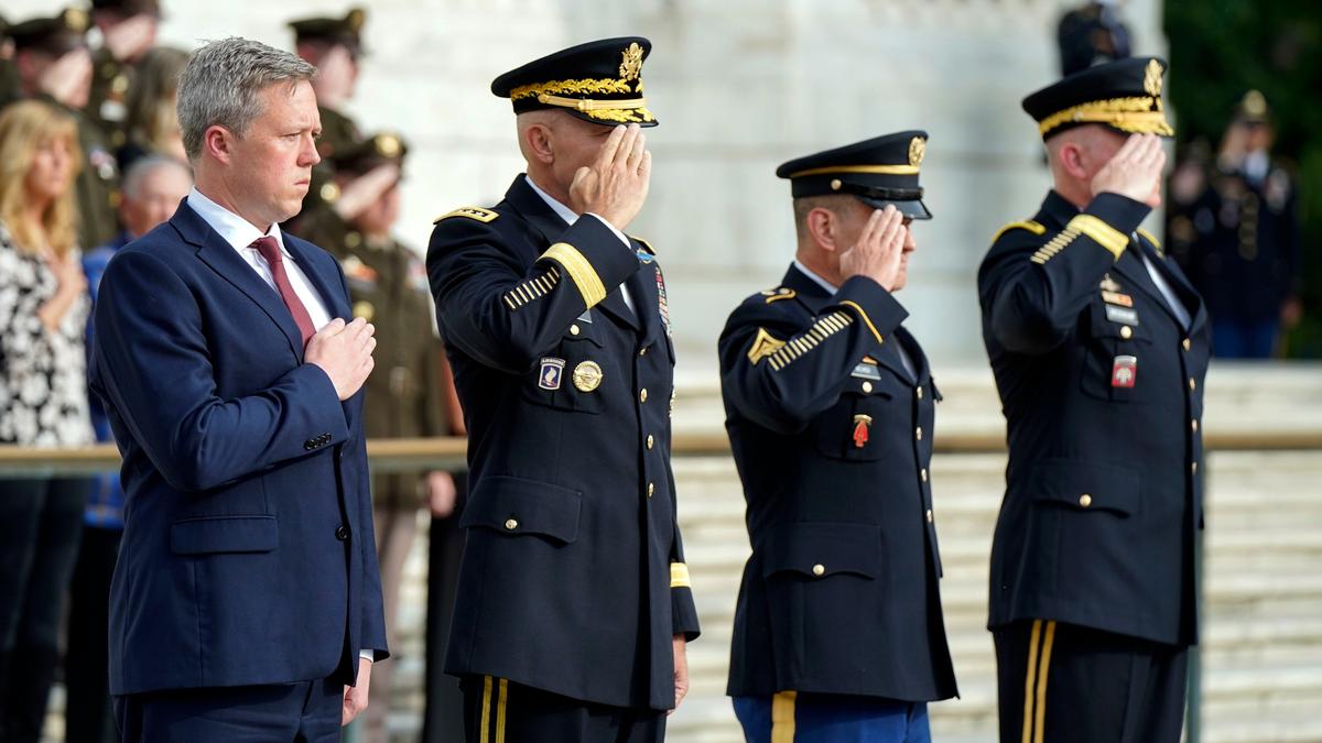 US Army Secretary Daniel Driscoll (L) participates in a ceremony honouring the Army's 250th Birthday at the Tomb of the Unknown Solider at Arlington National Cemetery, Virginia, 14 June 2025. Photo: EPA / BONNIE CASH