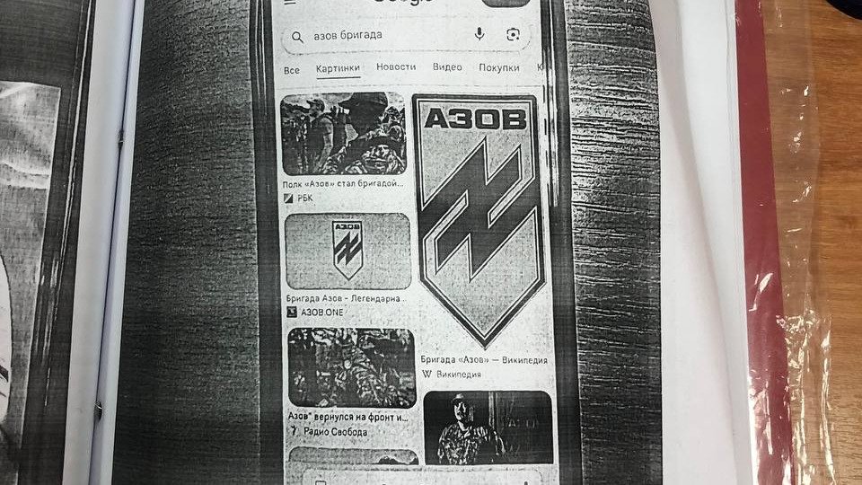 В новом протоколе полиция уточнила, что Глухих вбил в поиск через приложение Safari и браузер Google запрос «азов бригада», а затем получил доступ к «графическому изображению шеврона батальона “Азов”, состоящего из надписи “АЗОВ”, знака “Волчий крюк”, белого знака “черное солнце”, белого знака “вольфсангель”».