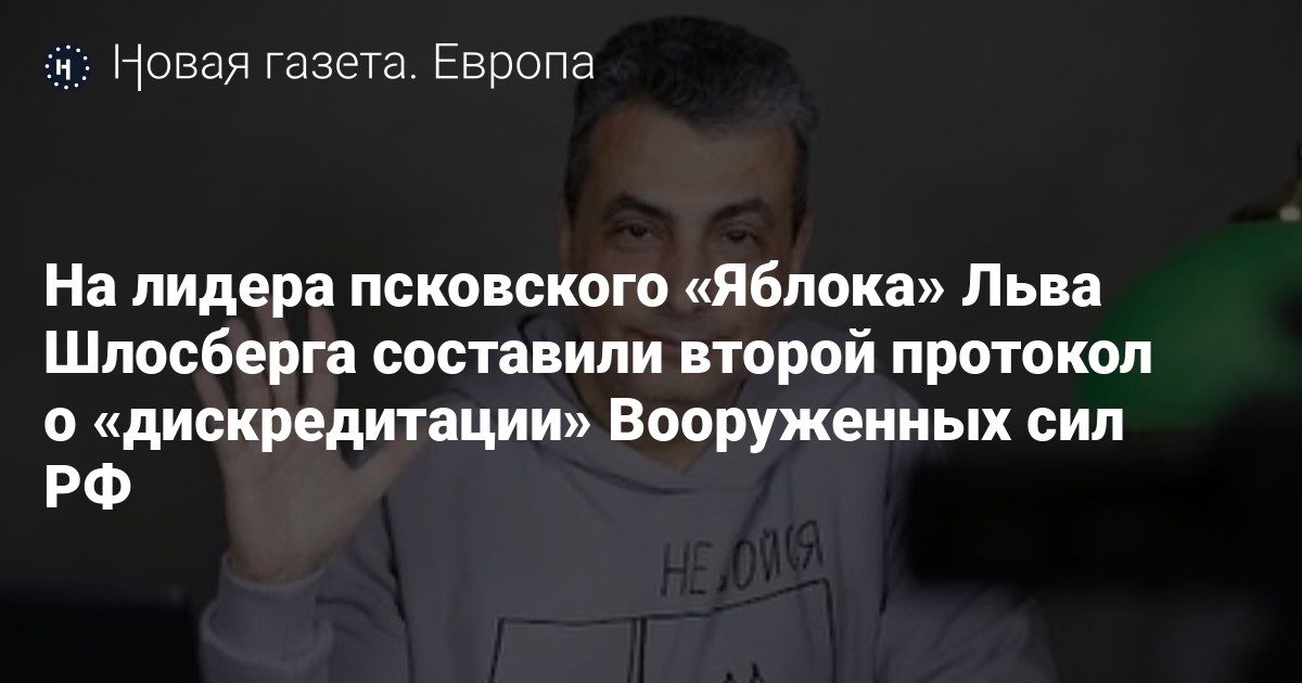 В отношении лидера псковского отделения партии «Яблоко» Льва Шлосберга составили второй протокол о «дискредитации» российской армии (часть 1 статьи 20.3.3 КоАП). Об этом политик написал в своем телеграм-канале.