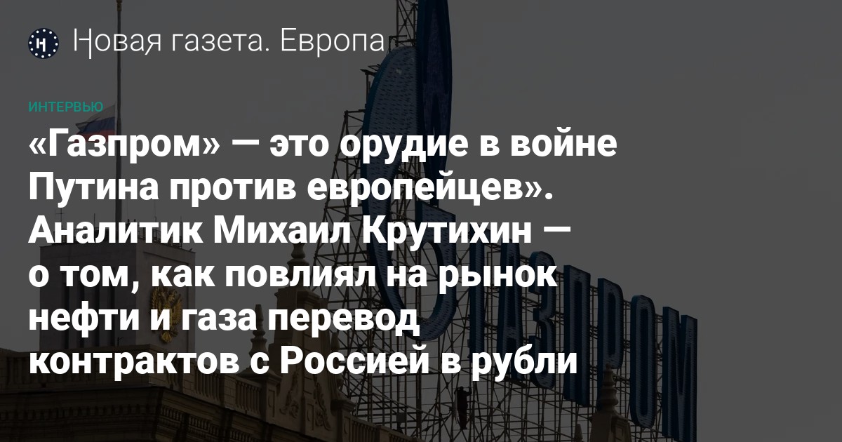 Новая газета. Европа поговорила с аналитиком нефтегазовой отрасли Михаилом Крутихиным о том, как повлиял на рынок принудительный перевод оплаты за газ из России в рубли, как война отразилась на рынке и что Россия будет делать с освободившимися объемами газа.
