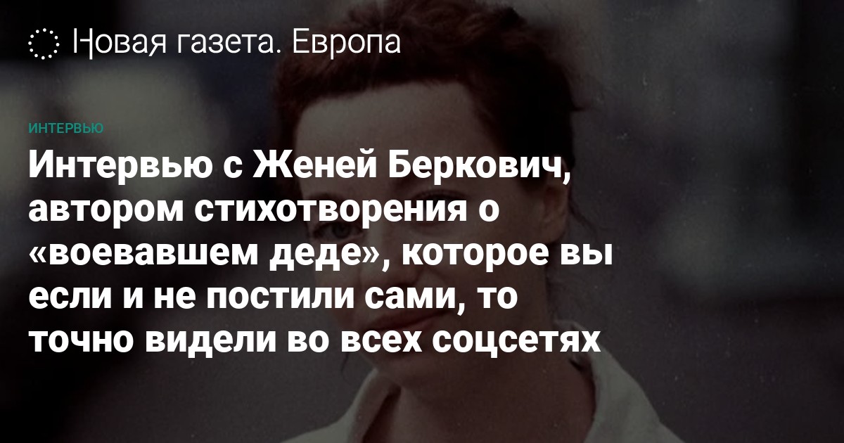 «Я отстрелялась раньше всех», говорит режиссер Женя Беркович. Утром 24 февраля она вышла из дома с плакатом, соответствующим ситуации, и была арестована на 11 суток. Ее арест прошел почти незамеченным, брали тогда охотно и много. Заметили Беркович гораздо позже, уже в середине мая, когда она выложила в интернет вот это стихотворение: