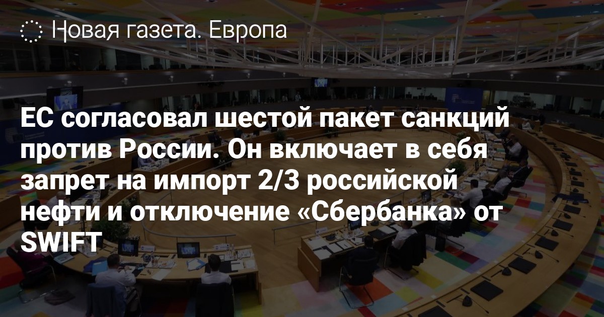 ЕС согласовал шестой пакет санкций против России. Он включает в себя запрет на импорт 2/3 российской нефти и отключение «Сбербанка» от SWIFT