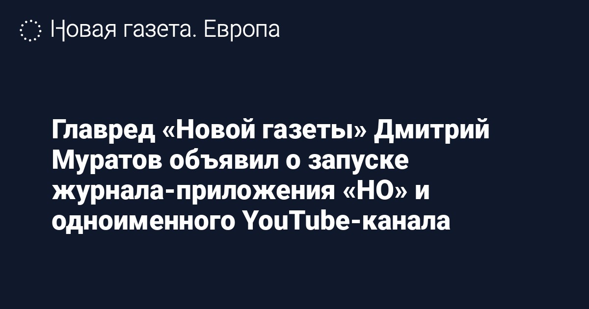 Редакция «Новой газеты» планирует запустить журнал-приложение к газете, который будет называться «НО», и одноименный YouTube-канал. Об этом сообщил в рассылке читателям главный редактор «Новой газеты» и лауреат Нобелевской премии мира 2021 года Дмитрий Муратов.