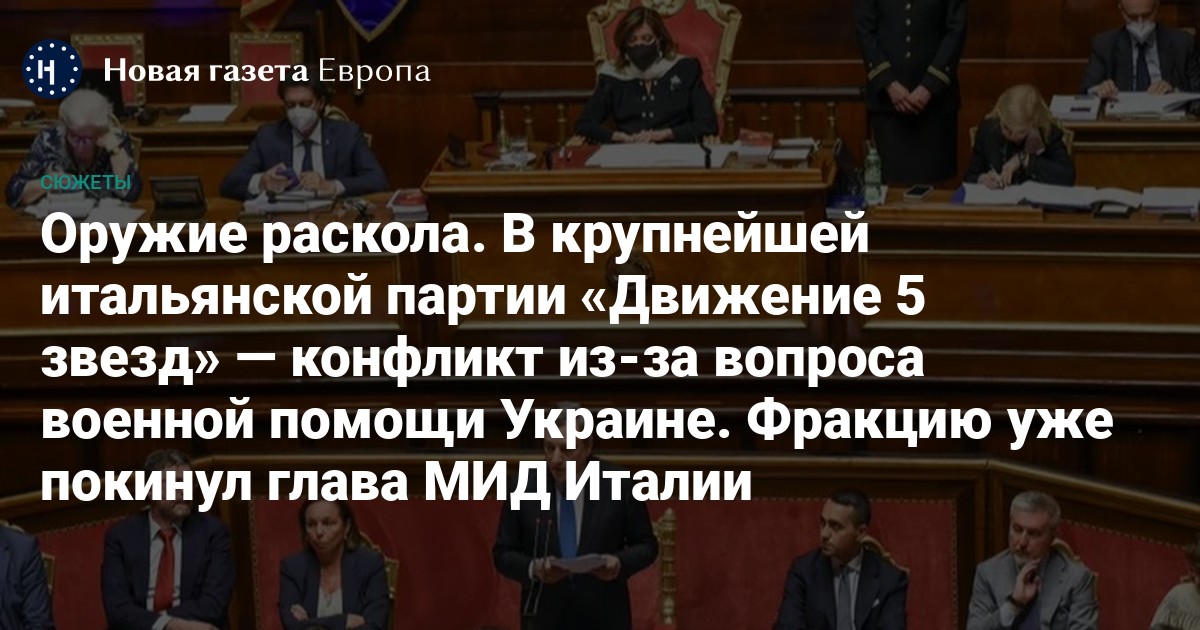 В одной из крупнейших фракций итальянского парламента — «Движении 5 звезд» — произошел раскол из-за вопроса о поставках вооружения в Украину. Глава МИД Италии 35-летний Луиджи Ди Майо после нескольких дней дебатов со скандалом покинул партию, обвинив ее главу, 57-летнего экс-премьера Джузеппе Конте, в подрыве усилий правительства по поддержке Украины. Причина — проект резолюции, подготовленный «Движением», в котором от правительства требовалось прекратить поставлять оружие Киеву.