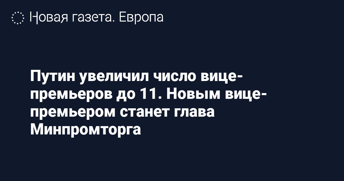 Президент России Владимир Путин подписал указ, увеличивающий количество заместителей председателя Правительства РФ с 10 до 11 человек. Согласно документу, новый вице-премьер будет совмещать эту должность с должностью главы Минпромторга. Указ опубликован на официальном интернет-портале правовой информации.