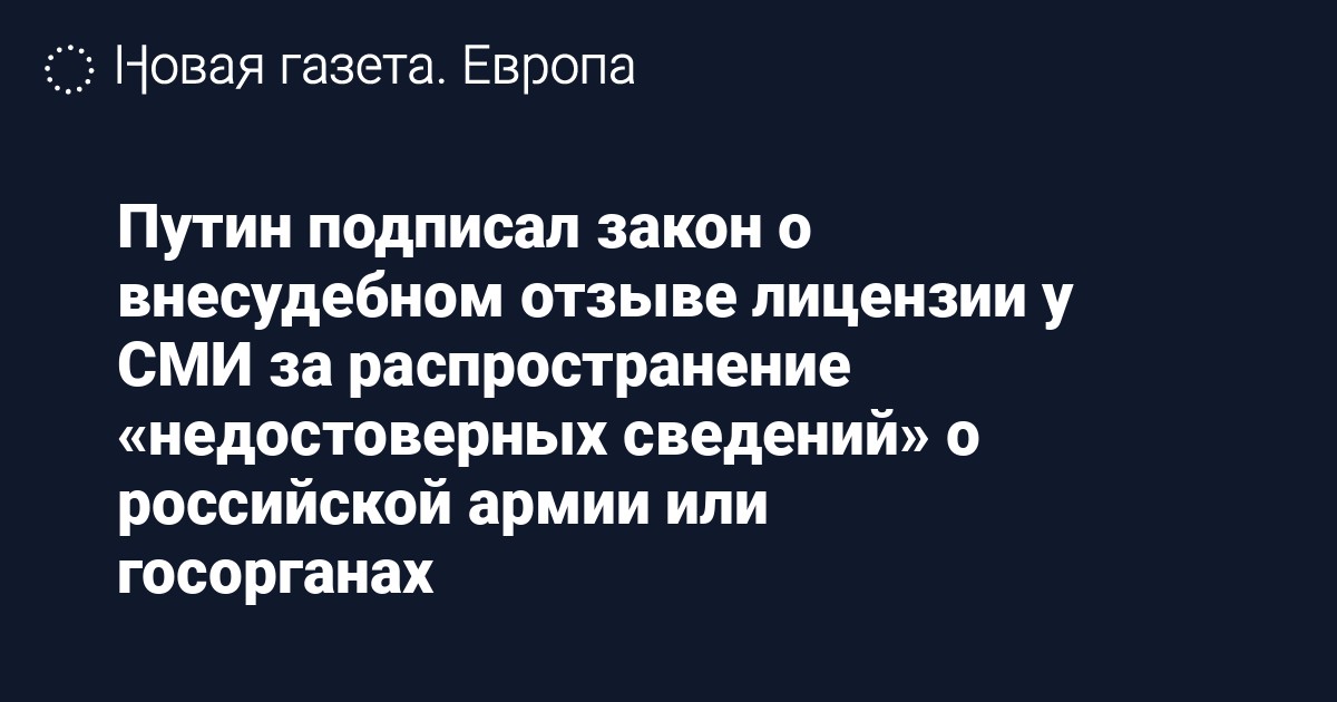 Президент России Владимир Путин подписал закон, предусматривающий внесудебный отзыв у СМИ лицензии на срок до полугода за распространение «недостоверных сведений» о действиях российской армии или госорганов. Он опубликован на официальном интернет-портале правовых актов.