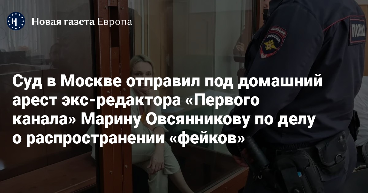 Басманный суд Москвы отправил под домашний арест бывшего редактора Первого канала Марину Овсянникову, обвиняемую в распространении «фейков» о российской армии. Об этом специально для «Новой газеты.Европа» сообщает Андрей Карев.