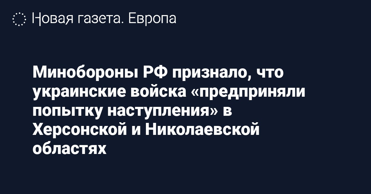Минобороны РФ признало, что украинские войска в понедельник в течение дня «предприняли попытку наступления» в Херсонской и Николаевской областях. Об этом сообщает РИА Новости.
