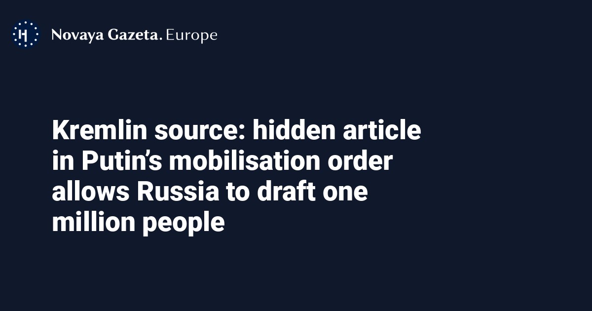 The hidden article seven of the mobilisation order allows the Russian Defence Ministry to draft one million people into the army, a source in the Kremlin administration told Novaya Gazeta. Europe.