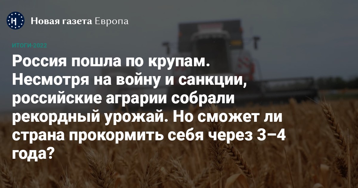 — Россия завершает уборку рекордного урожая зерновых и масличных. Основная причина максимальных сборов — почти идеальные погодные условия в большей части этого года. Жесткие ограничения на экспорт, введенные государством в прошлом году, пока не успели оказать заметного влияния на сектор — у аграриев накоплен некий «жировой» запас. При сохранении нынешних условий какие-то ощутимые изменения могут начаться через 3–4 года, — рассказал Сизов «Новой газете Европа».