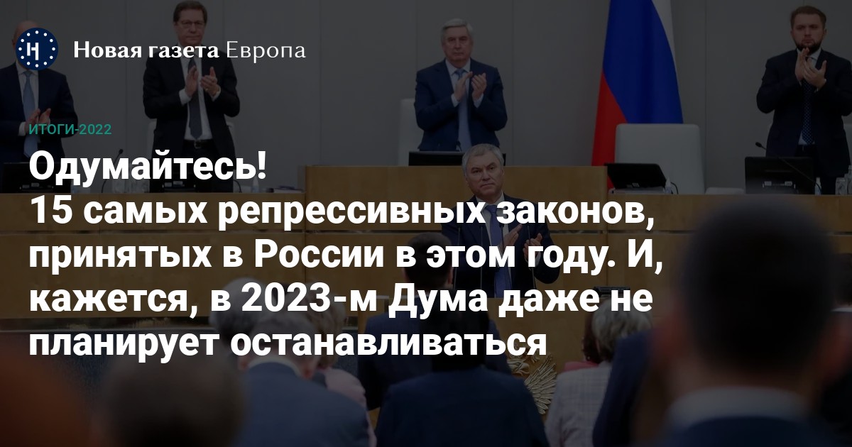 — В этом году всё законотворчество сводилось, с одной стороны, к развязыванию рук репрессивным органам для расширения репрессий, а с другой — к благополучному прохождению так называемой «специальной операции». То есть, по сути, законодательные органы занимаются обслуживанием силового, репрессивного блока, и армейского. Законы, которые были посвящены другим вопросам, — это какая-то необходимость, очевидно, просто текущая работа. Но главная тенденция — усиление репрессий и законодательное обеспечение военной кампании, которую ведет [президент России Владимир] Путин.