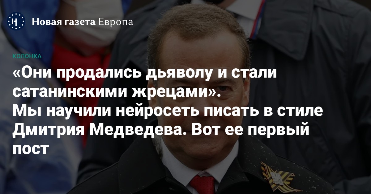Мы взяли за основу модель SberDevices, построенную на архитектуре GPT-3 (один из главных технологических прорывов прошлого года — нейросеть chatGPT — это следующее поколение той же модели). И обучили на постах самого Медведева и еще нескольких «патриотических» писателей, пропагандистов и Z-патриотов.