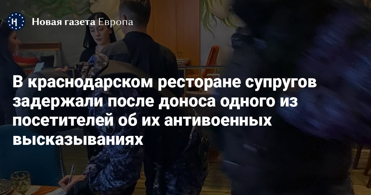 В краснодарском ресторане «На дровах» супругов Олесю и Алексея Овчинниковых задержали из-за антивоенных высказываний в личной беседе. Об этом их старшая дочь Арина Опарина сообщила «ОВД-Инфо».