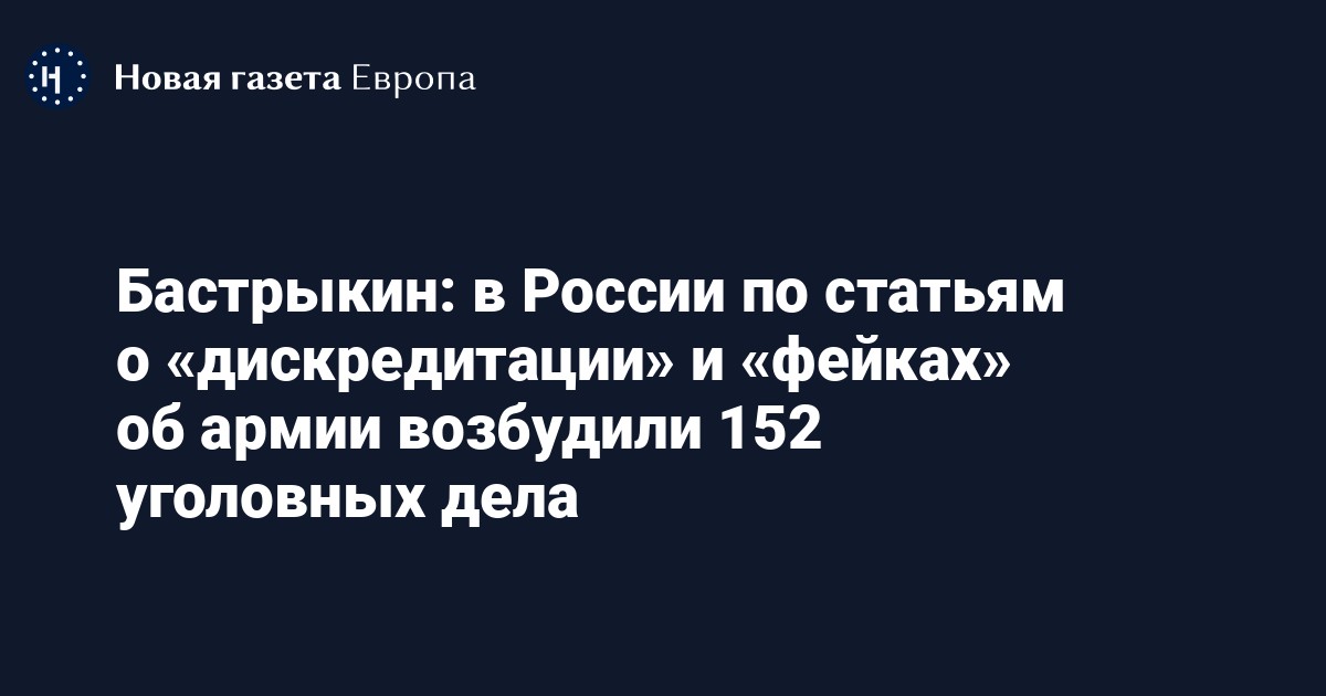 С начала войны в России возбудили 152 уголовных дела по статьям о «дискредитации» российской армии и распространении «фейков» о ней. Об этом глава Следственного комитета (СК) Александр Бастрыкин рассказал в интервью ТАСС.