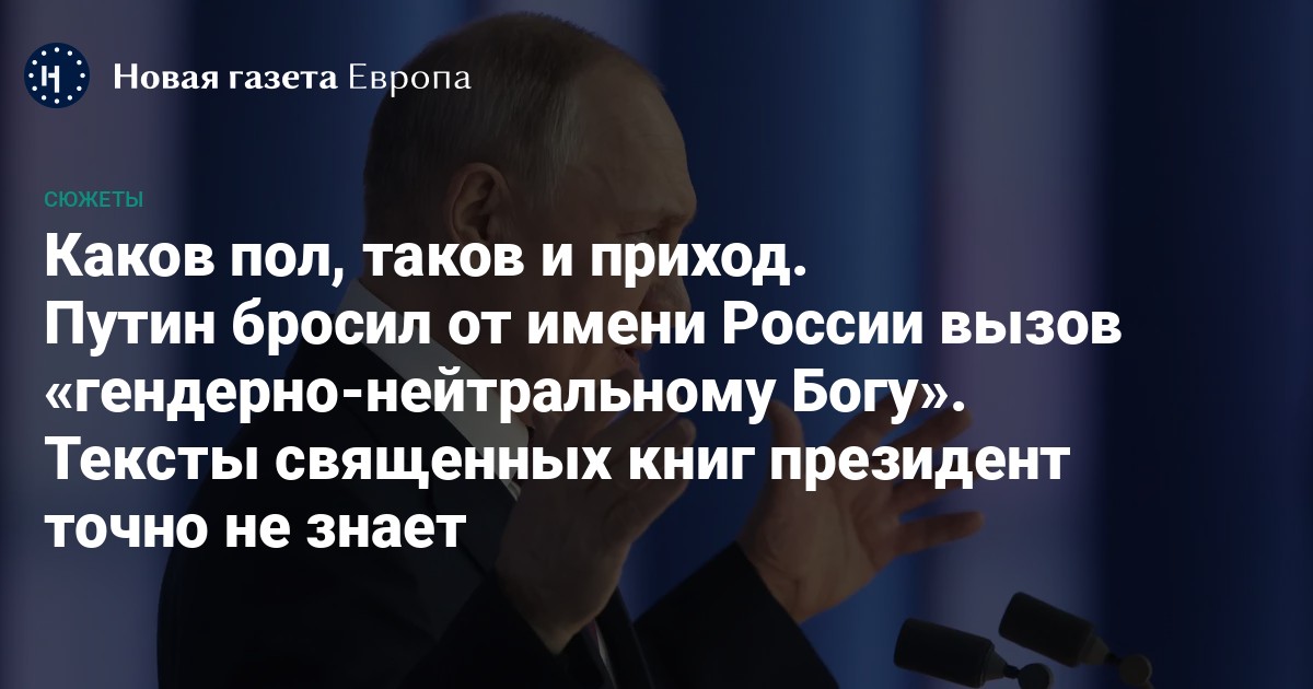 «Англиканская церковь, например, планирует… рассмотреть идею гендерно-нейтрального бога. Что тут скажешь? Прости господи, «не ведают, что творят», — заявил Владимир Путин 21 февраля в «богословской» части своего послания Федеральному собранию РФ. Написание слов «Бог» и «Господь» с маленькой буквы, характерное для атеистов или агностиков, приводится в соответствии с официальной публикацией на сайте президента РФ.