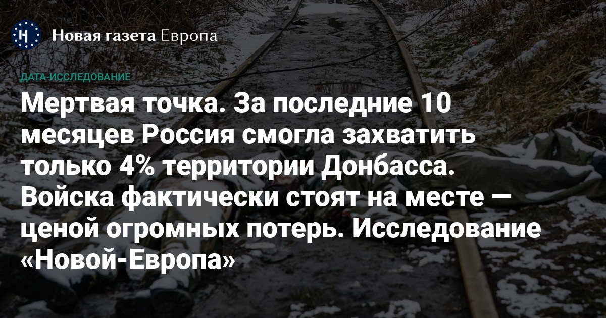 В итоге, с начала «битвы за Донбасс», за десять месяцев кровопролитных боев российская армия заняла чуть больше 2 тыс. кв. км. Это лишь 4% от территории Донецкой и Луганской областей. Всего оккупировано 77% площади двух регионов. Если предположить, что российская армия продолжит продвигаться в Донбассе с той же скоростью, она оккупирует его полностью через 4,5 года.