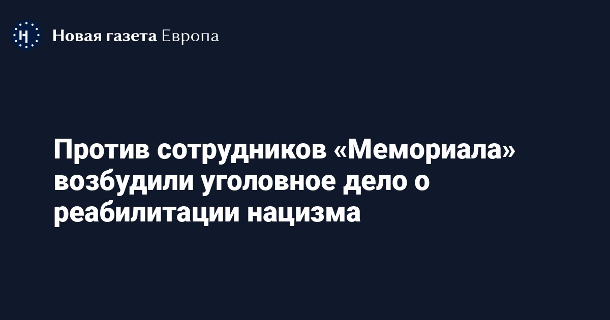 В отношении сотрудников «Мемориала» возбудили уголовное дело по статье о реабилитации нацизма (ст. 354.1 УК). Об этом сообщают ТАСС, РЕН ТВ и телеграм-канал ВЧК-ОГПУ со ссылкой на источники.