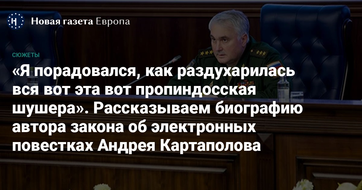 Андрей Картаполов, российский генерал-полковник в отставке, бывший замминистра обороны, ответственный за патриотическое воспитание молодежи, куратор «Юнармии» и храма Минобороны (там, где фрески со Сталиным, Путиным и Шойгу), а ныне — глава Комитета Государственной думы по обороне, автор того самого закона об электронных повестках и реестре военнообязанных, по сути, вводящего в отношении мужской части российского населения крепостное право.