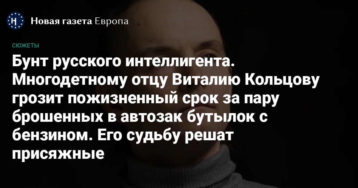 Год назад в центре Москвы, на площади Революции, загорелся автозак. Бутылку с зажигательной смесью в полицейский автобус бросил мужчина, который пришел на площадь в костюме, галстуке и с чемоданчиком, где лежал коробок спичек и телефон. Этим мужчиной оказался многодетный отец, поэт и разработчик интеллектуальных игр Виталий Кольцов. Против него возбудили уголовное дело о покушении на жизнь 12 силовиков и порче полицейского имущества. За Виталия борются друзья и близкие, а сам он уже год находится в СИЗО. Его дело сейчас рассматривает коллегия присяжных.