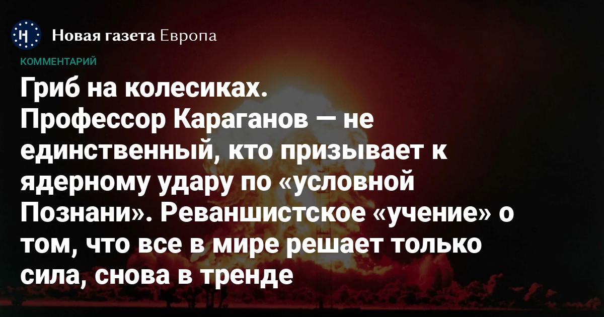 Сергей Караганов — доктор исторических наук, создатель и научрук факультета ВШЭ, любимый эксперт МИДа — кастинг на роль полубезумного кровожадного ученого прошел успешно. На днях он опубликовал статью под заголовком: «Тяжкое, но необходимое решение. Применение ядерного оружия может уберечь человечество от глобальной катастрофы». Содержание текста полностью соответствует его названию.