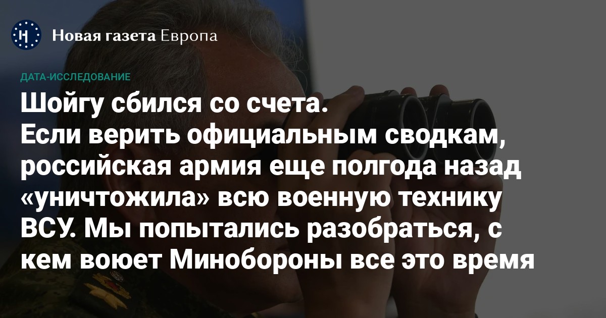 С первого дня вторжения в Украину Минобороны РФ публикует ежедневные сводки, в которых отчитывается о типах и количестве уничтоженной военной техники. Заявления российских чиновников не только противоречат друг другу, но и нарушают законы арифметики: например, из 8165 стоящих на вооружении ВСУ танков и бронемашин (с учетом поставок союзников) российской армией уже «уничтожено» 9915. Мы проанализировали отчеты российского командования с начала войны и рассказываем, что на самом деле известно о потерях сторон в военной технике.