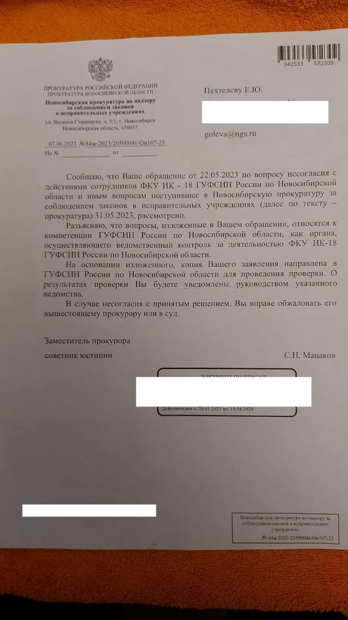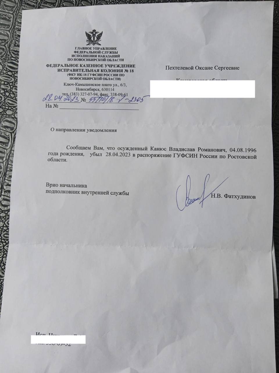 14 июня Оксана получила письмо от ГУФСИН по Новосибирской области. В нем было указано, что 28 апреля 2023 года осужденный Канюс Владислав Романович убыл в распоряжение ГУФСИН России по Ростовской области.