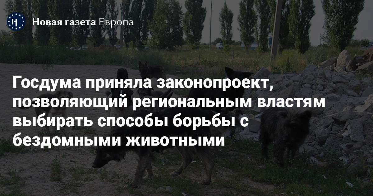 Государственная дума России приняла в третьем чтении законопроект, позволяющий региональным властям выбирать способ борьбы с бездомными животным. Об этом сообщается на сайте ГД.