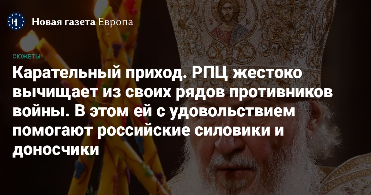 предназначенного властью к закланию. Самым показательным примером такого рода было дело среднеуральского схиигумена Сергия (Романова), но и в церковном деле костромского священника Иоанна Бурдина прямо говорится, что «совершенные им действия могут быть в будущем квалифицированы как уголовное преступление». Андрей Кураев признавался в том, что решение патриарха отречься от него, своего бывшего фаворита, может быть связано с тем, что в патриархии узнали о планах властей в отношении Кураева. Чудом из этих шестеренок успел выскочить бывший клирик храма в московском районе Люблино о. Иоанн Коваль, недавно «лишенный сана» за молитву о мире в Украине, которой он заменил молитву о победе ВС РФ. Вселенский (Константинопольский) патриарх признал церковное наказание о. Иоанна лишенным канонических оснований, принял его под свой омофор, и теперь он служит в приходе в Анталье. А священнику Александру Домбровскому из Брянской области, которого также собрались лишать сана за антивоенные проповеди, вообще удалось бежать в Украину и присоединиться к автокефальной Православной церкви Украины.