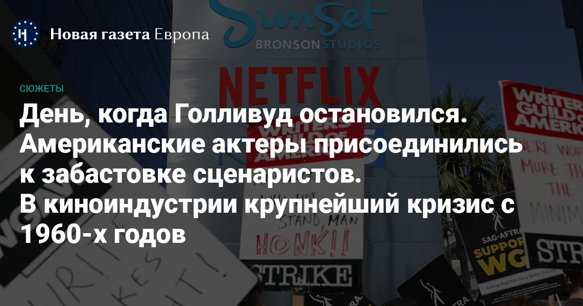 14 июля истек срок переговоров между американским профсоюзом актеров SAG-AFTRA и Гильдией кинопродюсеров AMPTP. За забастовку проголосовали 98% членов профсоюза. Таким образом, Гильдия киноактеров присоединилась к забастовке Гильдии сценаристов (WGA), которая продолжается с конца мая. Всего на момент написания заметки бастуют более 170 тысяч работников — фактически 134-миллиардная индустрия поставлена на паузу. Двойная забастовка происходит впервые с 1960 года, когда Мэрилин Монро еще снималась в кино, а профсоюз актеров возглавлял будущий президент США Рональд Рейган.
