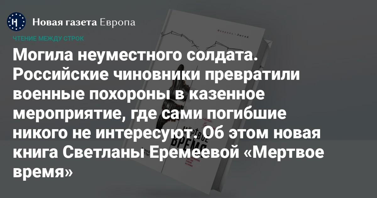 В минувшую пятницу эмигрантское издательство «Freedom letters» выпустило книгу известного культуролога Светланы Еремеевой «Мертвое время». Ее тема одновременно привлекает и отпугивает. В центре внимания — военные похороны в России и Украине 2022 года и то, как их показывали в медийном поле: в СМИ, блогах и на ютуб-каналах. Впрочем, книга, конечно, не о мертвых. Смерть — только линза, позволяющая автору присмотреться к обществам двух стран. Тем у Еремеевой, на самом деле, много. Это и способность людей к объединению, и понимание героизма, и всегда сложное выстраивание отношений между гражданами и властью, — наконец, отношение к личности и человеческой жизни. В последнем сюжете, может быть, и кроется глубинная причина тех невеселых итогов, к которым Россия пришла на излете первой четверти XXI века.