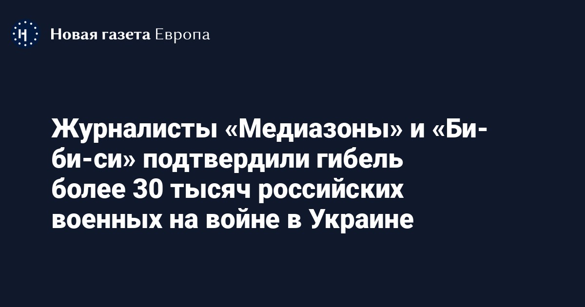 С начала полномасштабного вторжения России в Украину 24 февраля 2022 года погибли как минимум 30 003 российских военных. К такому выводу пришли журналисты Русской службы «Би-би-си» и «Медиазоны» после анализа данных из открытых источников.