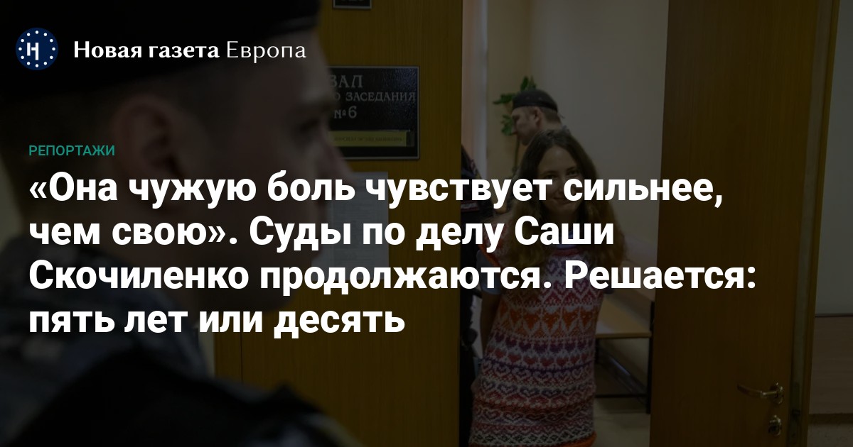 Скочиленко — первый человек в Петербурге, в отношении которого следователи применили новую политическую статью, появившуюся в Уголовном кодексе России только в марте прошлого года. Затем в Северной столице возбудили еще восемь аналогичных дел. Трём фигурантам из девяти (Олегу Белоусову, Ольге Смирновой, Иоанну Курмоярову) на сегодня уже вынесены приговоры. Когда дождется вердикта Александра, предугадать сложно. Процесс длится уже десятый месяц. А сама Саша, страдающая тяжелыми, угрожающими ее жизни, заболеваниями, содержится под арестом в СИЗО уже полтора года.