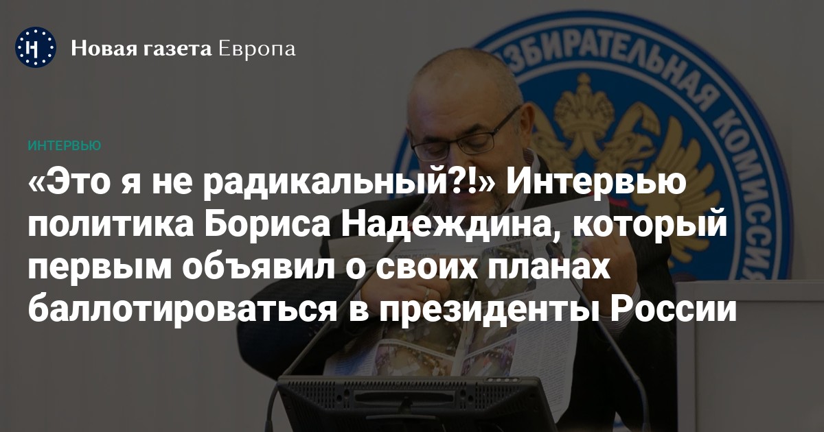 Борис Надеждин называет себя профессиональным политиком и всё время повторяет, что участвует в разных выборах уже почти 35 лет. Когда-то он был депутатом Госдумы от СПС, однажды участвовал в праймериз «Единой России», а сейчас возглавляет фракцию «Справедливой России» в городском совете Долгопрудного под Москвой.