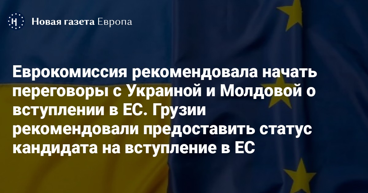 Еврокомиссия рекомендовала совету Евросоюза начать переговоры с Украиной и Молдовой о вступлении в ЕС, а также предоставить Грузии статус кандидата на вступление в ЕС. Об этом сообщается в твиттере ЕК.