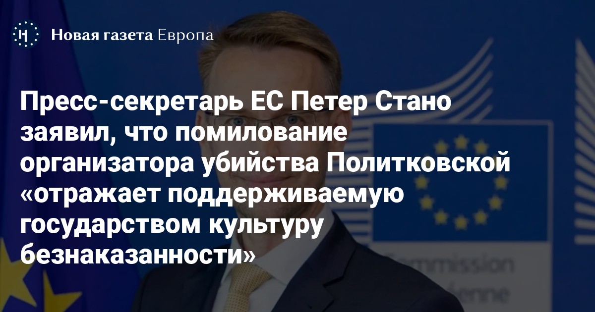 Пресс-секретарь ЕС Петер Стано заявил, что помилование организатора убийства Политковской «отражает поддерживаемую государством культуру безнаказанности»