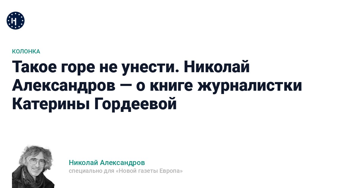 В издательстве «Медуза» вышла книга «Унеси ты мое горе». Она состоит из разговоров с теми, чьи жизни переломила война, — украинками и украинцами. В некоторых аннотациях пишут — с «жертвами». Но в книге Гордеевой они становятся героями — и по жанру, и по существу. Это документальный роман — собрание голосов, свидетельств и свидетелей ужаса и трагедии. Читать книгу нелегко. Но начав, уже трудно остановиться. Говорить нейтрально здесь невозможно: истории вызывают личные переживания. По просьбе «Новой газеты Европа» литературный критик Николай Александров прочитал книгу Гордеевой и в ответ делится своими — тоже личными — переживаниями.