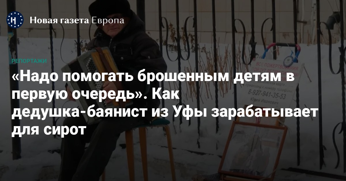 Юрию Иванову из Уфы 72 года. Он вырос сиротой, а теперь сам помогает детдомовцам. Мужчина — уличный музыкант — играет на баяне, а на заработанные деньги покупает вещи и игрушки для детских домов.