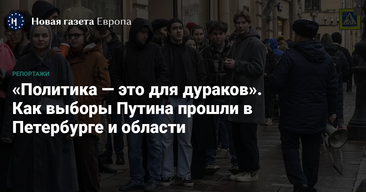 В Петербурге третий день мероприятия, которое в России продолжают называть выборами президента, был очень спокойным. Словно и не было накануне, с одной стороны, призывов создать очереди «в полдень против Путина», а с другой — предупреждений о том, что именно в полдень 17 марта очередь на избирательный участок — это преступление. В центре Питера в это время заметили какое-то оживление, а в спальных районах не происходило ровным счетом ничего. Если, конечно, не считать несчастным случаем сами эти «выборы».