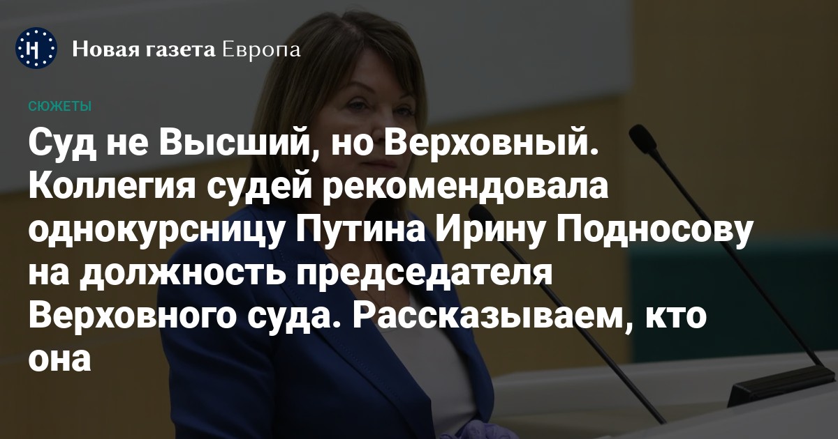 Коллегия судей рекомендовала однокурсницу Путина Ирину Подносову на должность председателя Верховного суда. Рассказываем, кто она